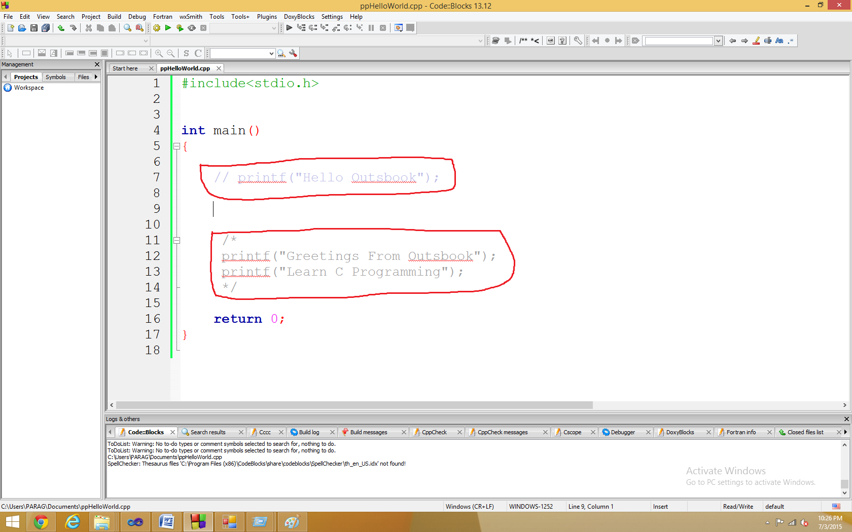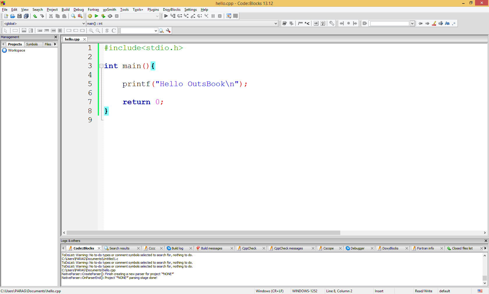 The printf is used for printing things on the screen, in this case the words: Hello OutsBook. As you can see the data that is to be printed is put inside round brackets. The words Hello OutsBook are inside inverted commas, because they are what is called a string. (A single letter is called a character and a series of characters is called a string). Strings must always be put between inverted commas. The \n is called an escape sequence. In this case it represents a newline character. After printing something to the screen you usually want to print something on the next line. If there is no \n then a next printf command will print the string on the same line.